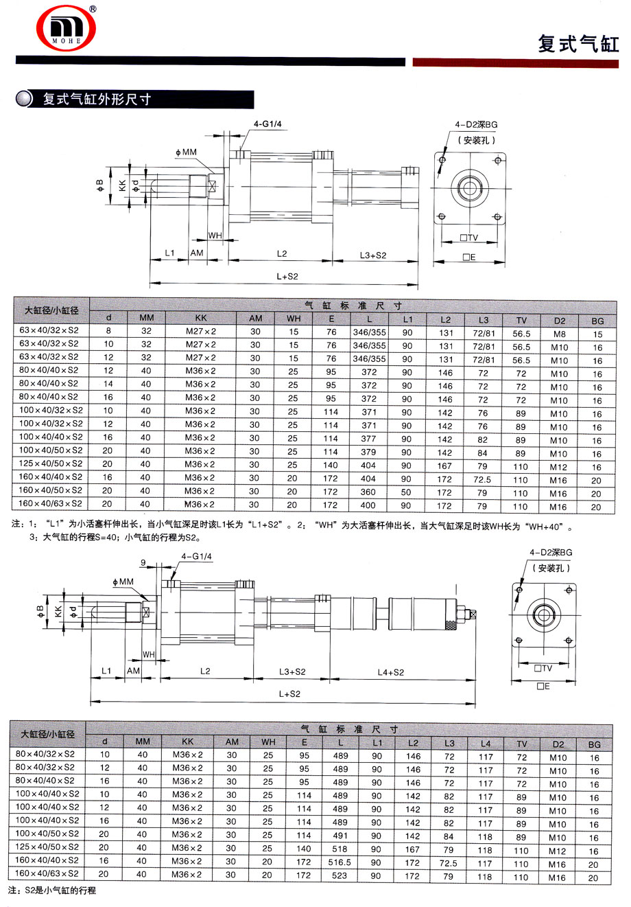 注:1、"L1"為小活塞桿伸出長(zhǎng),當(dāng)小氣缸深足時(shí)該L1長(zhǎng)為"L1+S2";