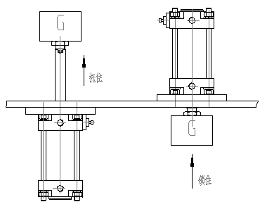 當氣缸的活塞桿縮進到底時(見示圖右側(cè)),如果氣缸無供氣(因停氣或調(diào)試需要)氣缸后蓋端的柱塞會自動地把活塞桿鎖住,活塞桿端部的重物"G"不會再移動。同樣,在活塞桿伸出到頂時,需前鎖的前蓋端的柱塞也能把活塞桿鎖住,使重物"G"不會落下(見示圖左側(cè)),當恢復供氣(帶鎖端有氣)時,自動解鎖。(也可以手動解鎖)