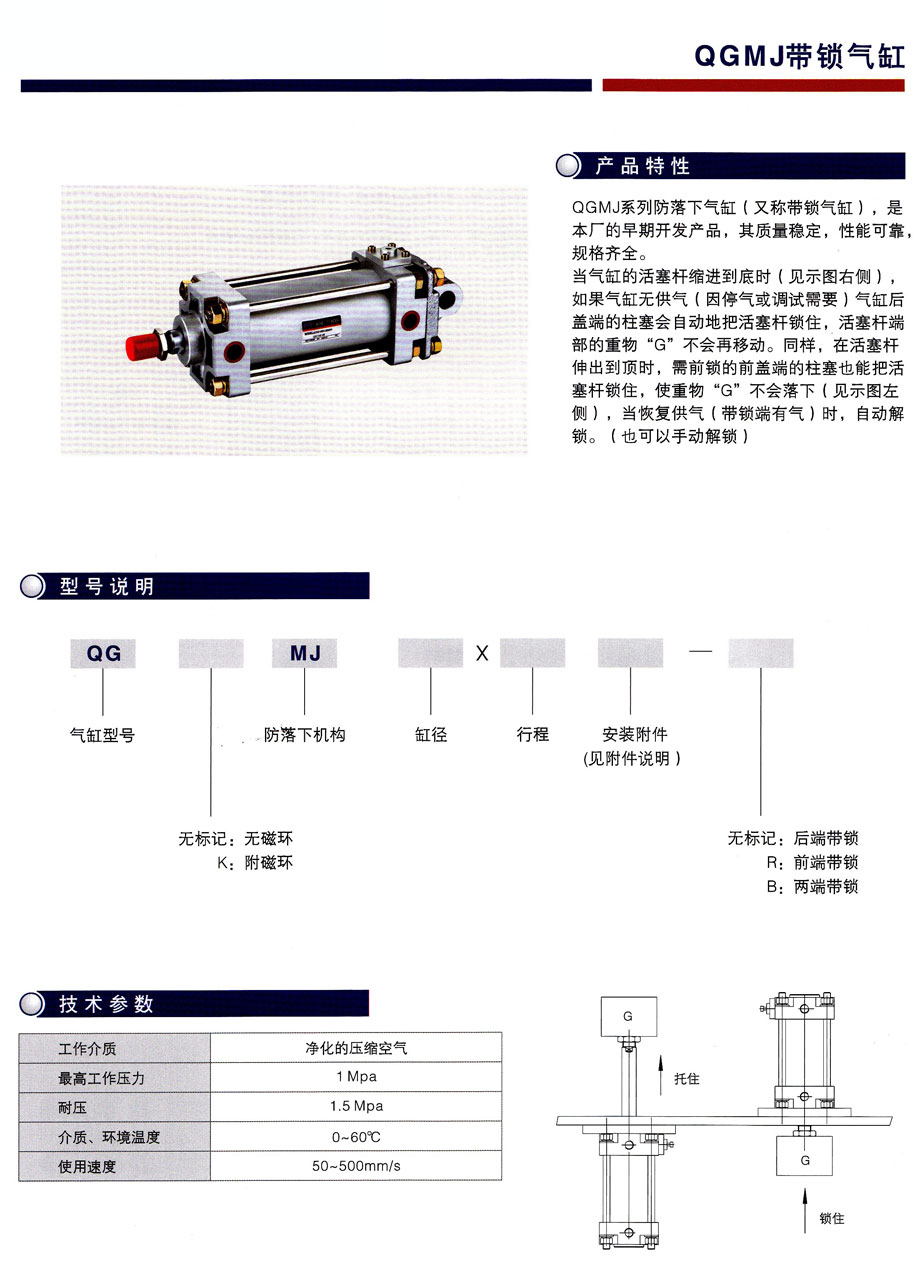 備注: QGMJ系列防落下氣缸(又稱帶鎖氣缸),是本廠的早起開發(fā)產(chǎn)品,其質(zhì)量穩(wěn)定,性能可靠,規(guī)格齊全。? 當氣缸的活塞桿縮進到底時(見示圖右側(cè)),如果氣缸無供氣(,QGMJ帶鎖氣缸,MOHE CYLINDER,MOHE氣缸